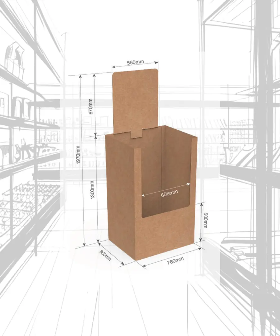 Fabricado en cartón, este tipo de PLV combina ligereza, resistencia y sostenibilidad, con gran capacidad para contener producto.