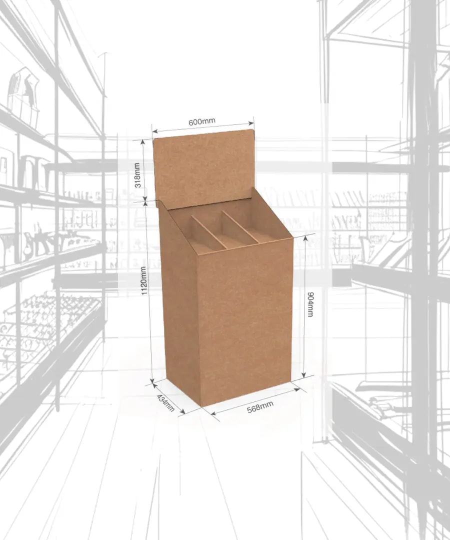 Fabricado en cartón, este tipo de PLV combina ligereza, resistencia y sostenibilidad, con gran capacidad para contener producto.