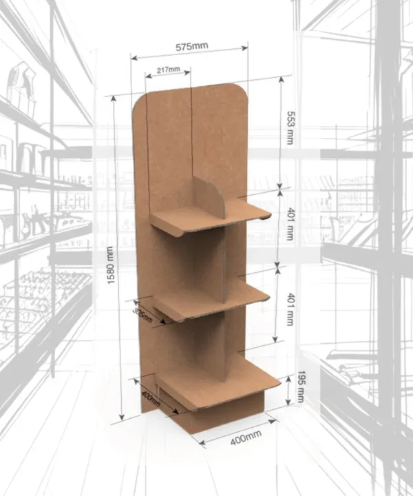 Fabricado en cartón, este tipo de PLV combina ligereza, resistencia y sostenibilidad, con estanterías para colocar producto.