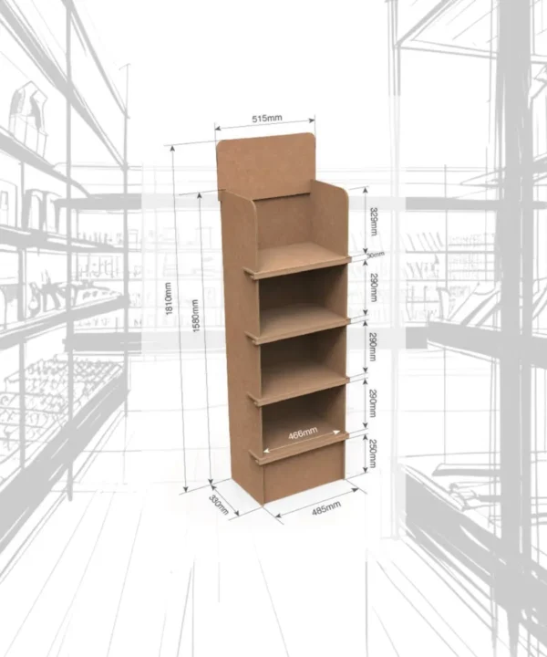 Fabricado en cartón, este tipo de PLV combina ligereza, resistencia y sostenibilidad, con estanterías para colocar producto.
