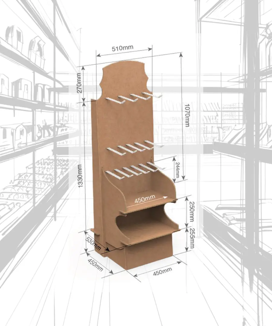 Fabricado en cartón, este tipo de PLV combina ligereza, resistencia y sostenibilidad, con estanterías para colocar producto así como ganchos de plástico para blisters.