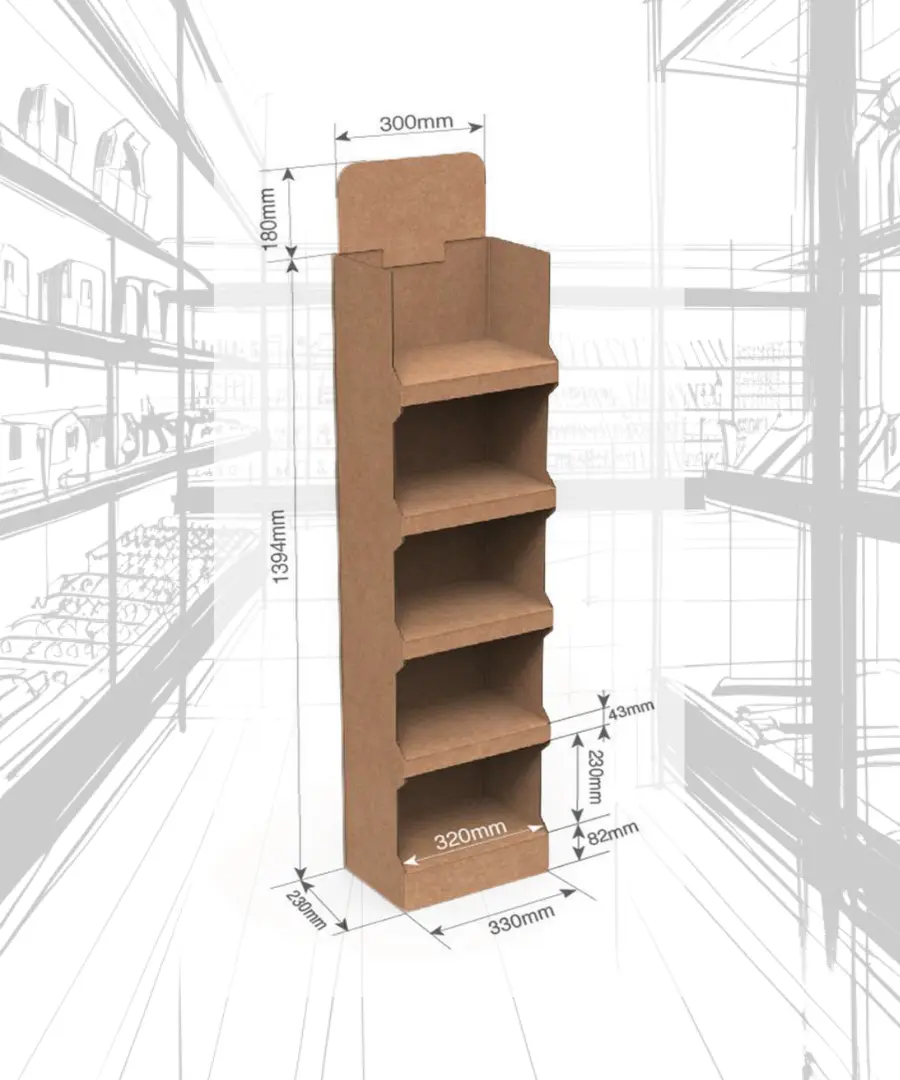 Fabricado en cartón, este tipo de PLV combina ligereza, resistencia y sostenibilidad, con estanterías para colocar producto.