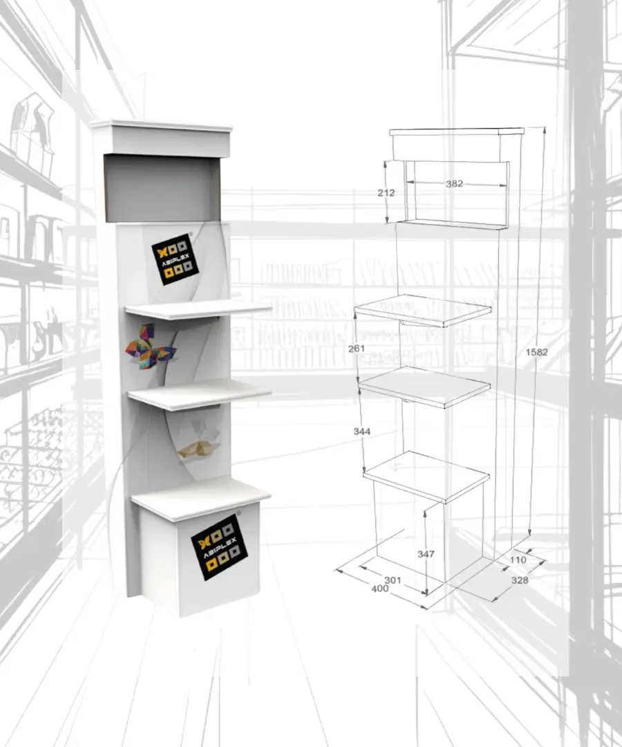 Fabricado en cartón, este tipo de PLV combina ligereza, resistencia y sostenibilidad, con estanterías para colocar producto.