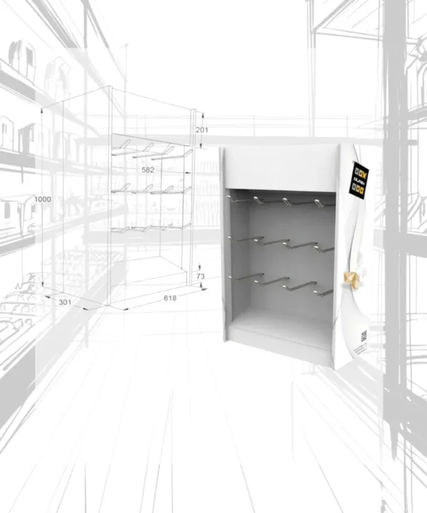 Fabricado en cartón, este tipo de PLV combina ligereza, resistencia y sostenibilidad, con estanterías para colocar producto así como ganchos de plástico para blisters.
