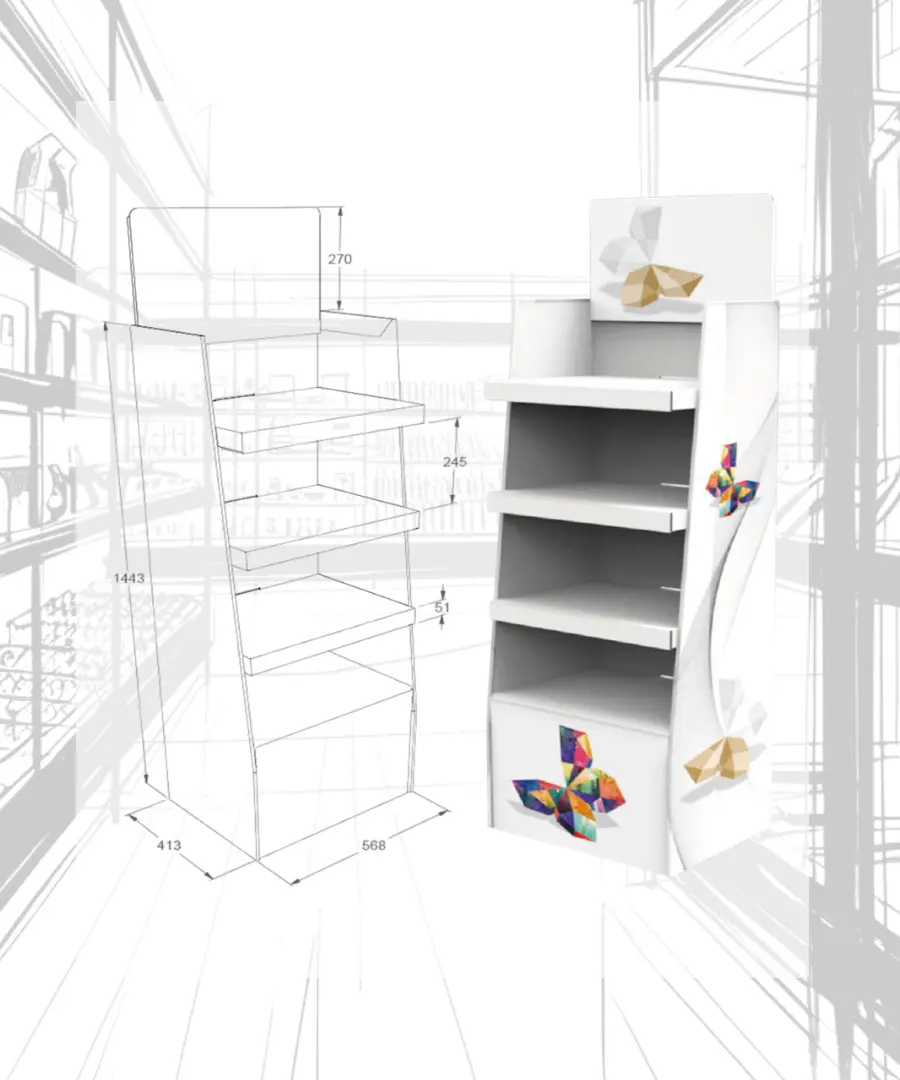 Fabricado en cartón, este tipo de PLV combina ligereza, resistencia y sostenibilidad, con estanterías para colocar producto.