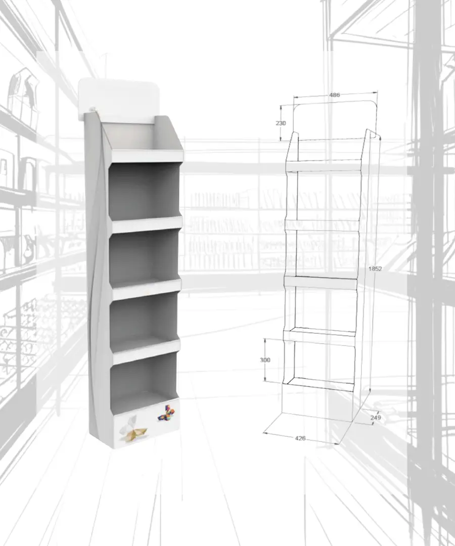 Fabricado en cartón, este tipo de PLV combina ligereza, resistencia y sostenibilidad, con estanterías para colocar producto.