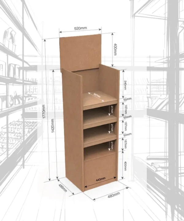 Fabricado en cartón, este tipo de PLV combina ligereza, resistencia y sostenibilidad, con estanterías para colocar producto.