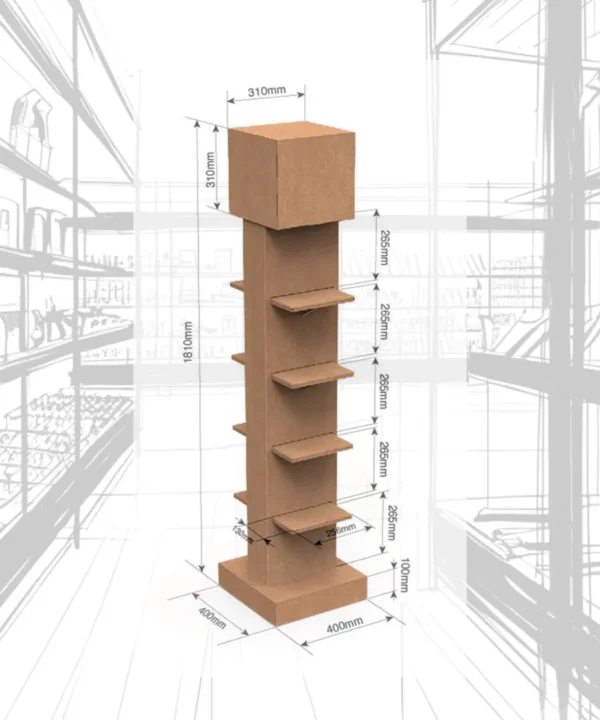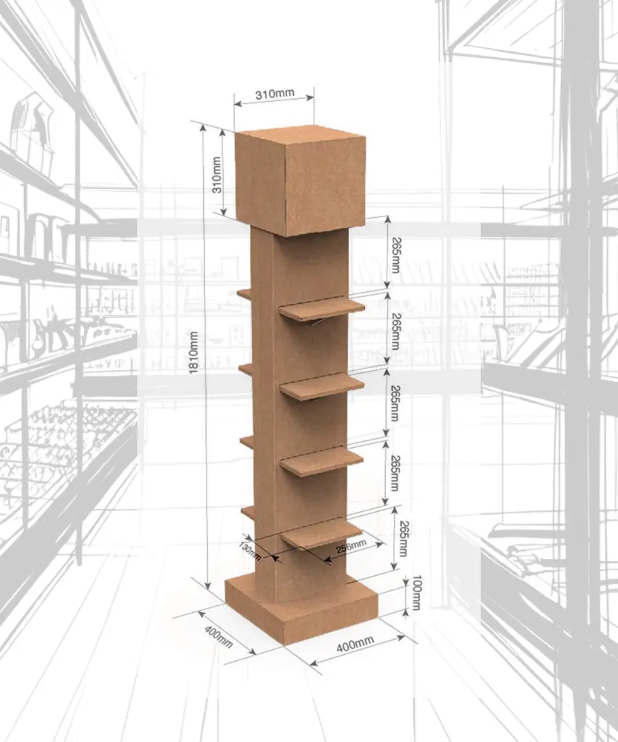 Fabricado en cartón, este tipo de PLV combina ligereza, resistencia y sostenibilidad, con estanterías para colocar producto.